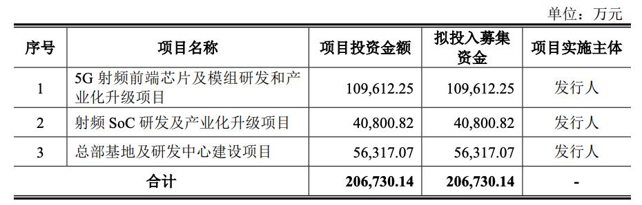 此次IPO,昂瑞微实际募集资金为20.67亿元,未来发展规划包括11亿元用于5G射频前端芯片及模组研发和产业化升级项目、4.1亿元用于射频SoC研发及产业化升级项目、5.6亿元用于总部基地及研发中心建设项目。