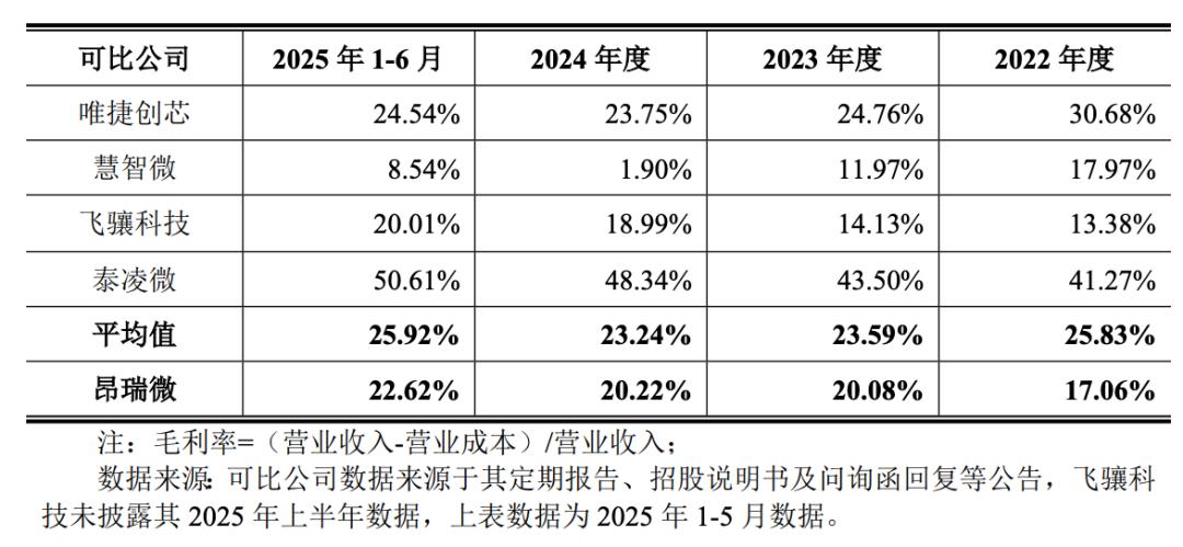 与同行业可比公司毛利率相比,昂瑞微毛利率略低于同行业可比公司平均水平,对比情况如下: