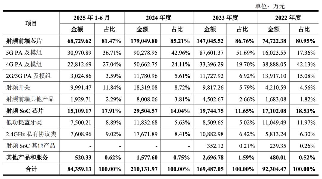 从营收占比来看,该公司的射频前端芯片是主要收入来源,三年半营收占比均超过80%,细分领域的5G PA及模组、4G PA及模组占比最高。