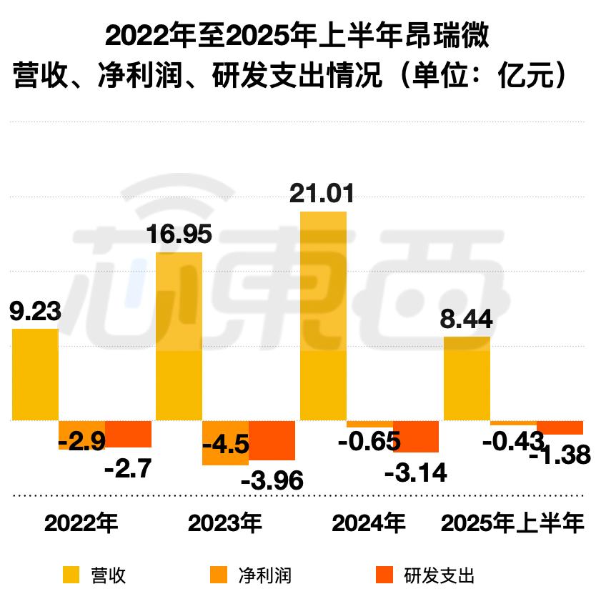 2022年至2025年上半年,昂瑞微营收分别为9.23亿元、16.95亿元、21.01亿元、8.44亿元,近三年营收复合增长率达到50.88%。同期,该公司的净利润分别为-2.9亿元、-4.5亿元、-0.65亿元、-0.43亿元。