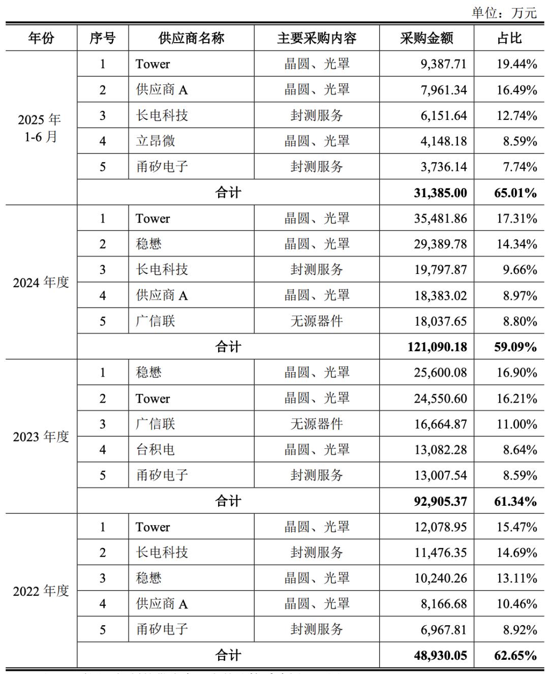 昂瑞微采用Fabless经营模式,晶圆制造、芯片封装测试等生产环节委托第三方完成,供应商主要包括稳懋、Tower、长电科技、甬矽电子。报告期内,该公司对前五大供应商的采购比例分别占当期采购总额的62.65%、61.34%、59.09%和65.01%。