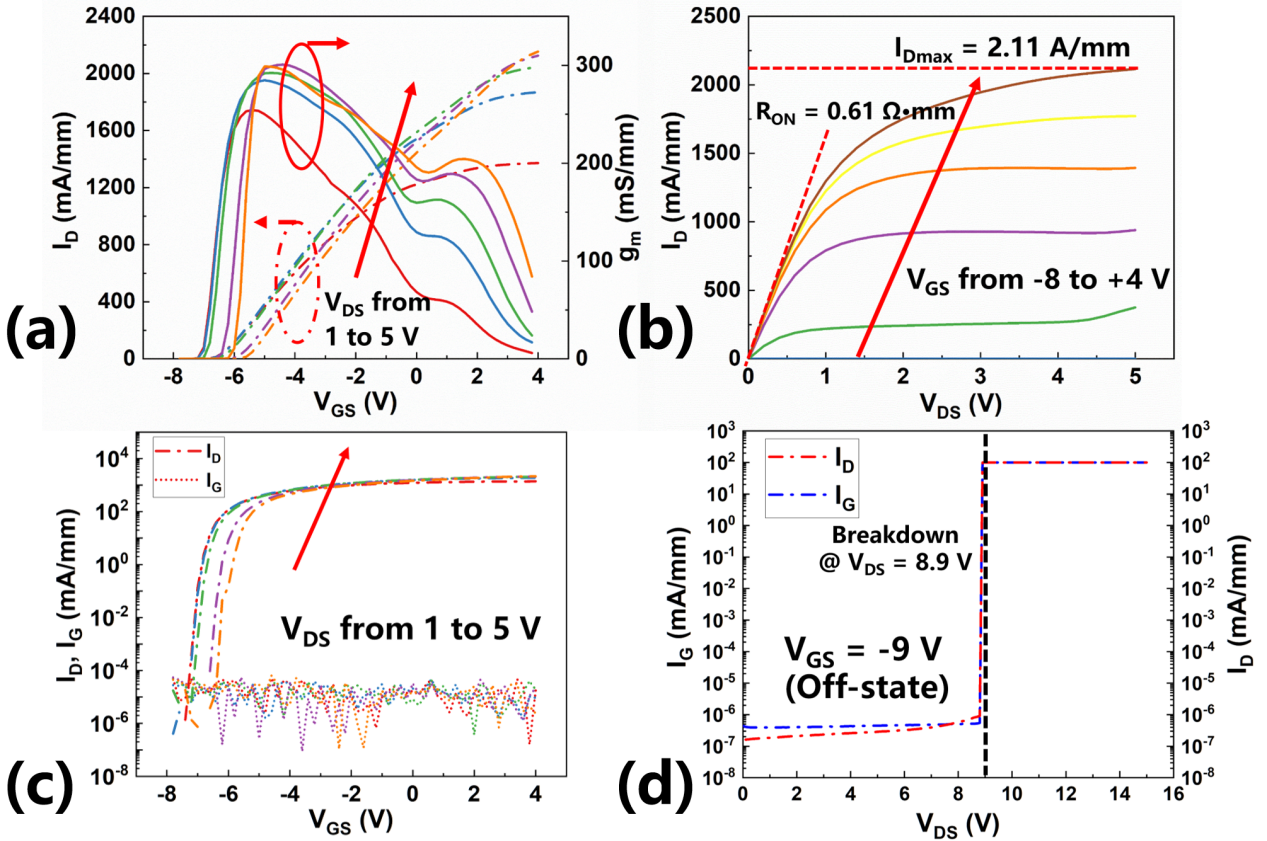 研究团队通过将源漏极欧姆接触区域延伸至栅极边缘,并采用n⁺⁺-GaN二次外延技术,有效抑制了常规器件中由非栅控2DEG区域引入的接入区电阻,进而显著提升了器件的输出特性。该器件在550 nm栅长下,实现了2.11 A/mm的饱和电流密度、300 mS/mm的峰值跨导以及0.61 Ω·mm的低导通电阻,欧姆接触电阻低至0.09 Ω·mm。