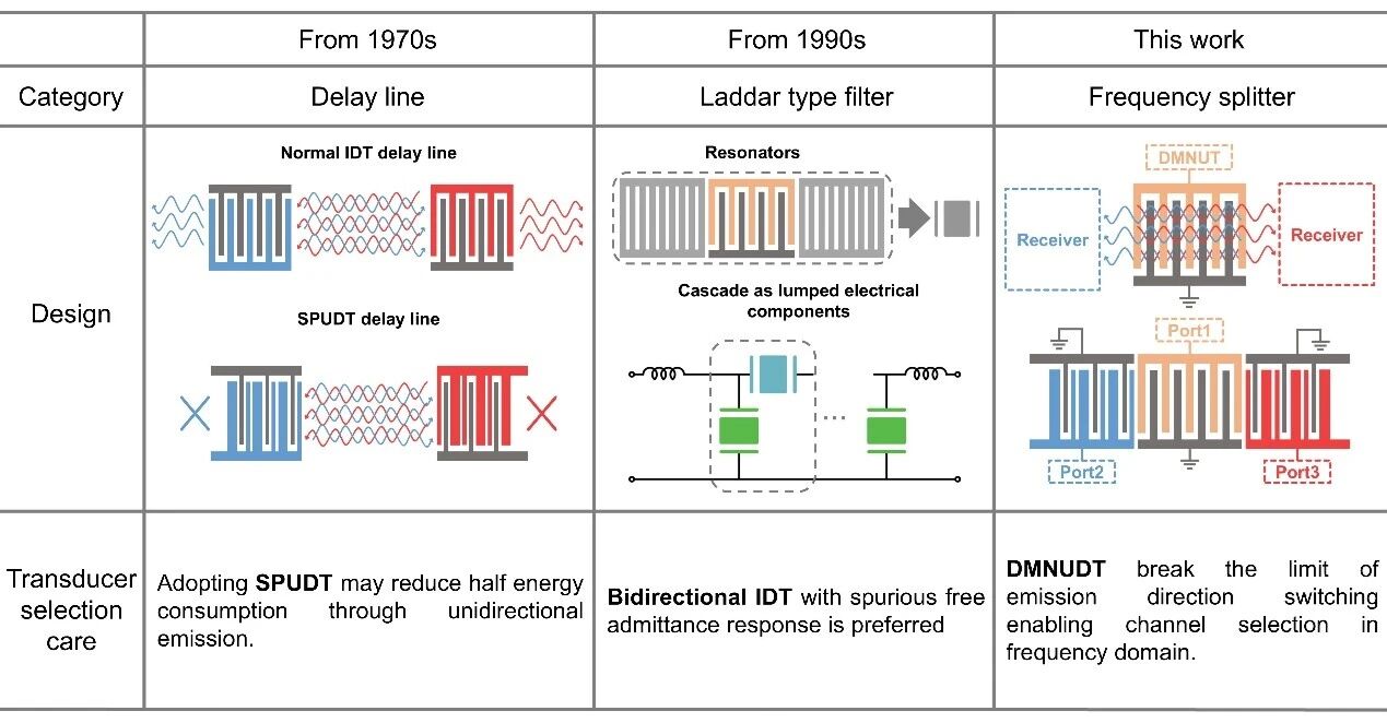 自1965年White发明叉指换能器(IDT)以来,声表面波就成为了研究声子物理的一个便捷的平台,被广泛的应用在声光耦合、自旋电子学、传感、射频滤波、量子技术以及微流控等领域。声子的精准控制可以带来提高系统的信噪比,降低系统功耗并提高系统的稳定性,因此,研究人员开发了诸多声子调控手段。例如给声子装上轨道的声波导,增强声波幅度电声放大器,以及调整声波相位的移相器等。目前研究更多关注声波传输过程中的调控,本工作则聚焦在声波发射的过程。