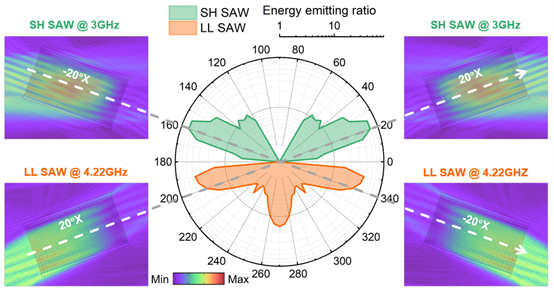 图1 42°Y切LT/SiC衬底上的天然单向发射现象。对于沿特定方向布置的DMNUDT,LL SAW模式和SH SAW模式朝相反的方向发射。