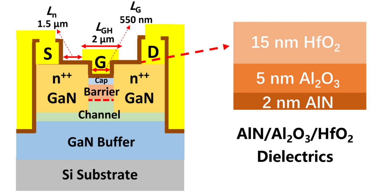 近年来,5G通信应用向手机等移动终端场景深度拓展,对低压高性能射频功率放大器(PA)的需求日益迫切。氮化镓(GaN)高电子迁移率晶体管(HEMT)因其高电子饱和速率和优异的二维电子气(2DEG)输运特性,已成为实现高性能射频前端的理想选择。然而,常规GaN器件存在较高的膝点电压,严重制约了其在低压条件下的射频输出性能。针对这一问题,国际上的常规做法是采用强极化异质结(如InAlN/GaN、AlN/GaN等)以及“深度缩放”工艺路线,对加工精度要求较高。
