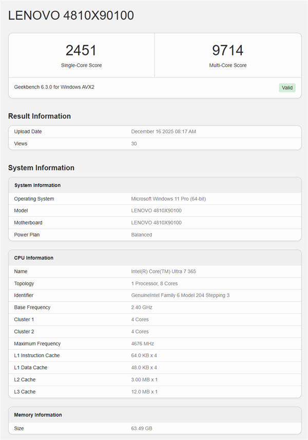 根据Geekbench 6.3的测试记录,酷睿Ultra 7 365在单核测试中得分为2451,多核得分为9714;作为对比,其前代产品酷睿Ultra 7 268V的平均成绩分别为2639和10318。