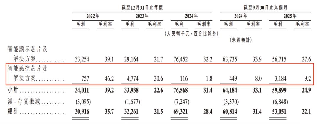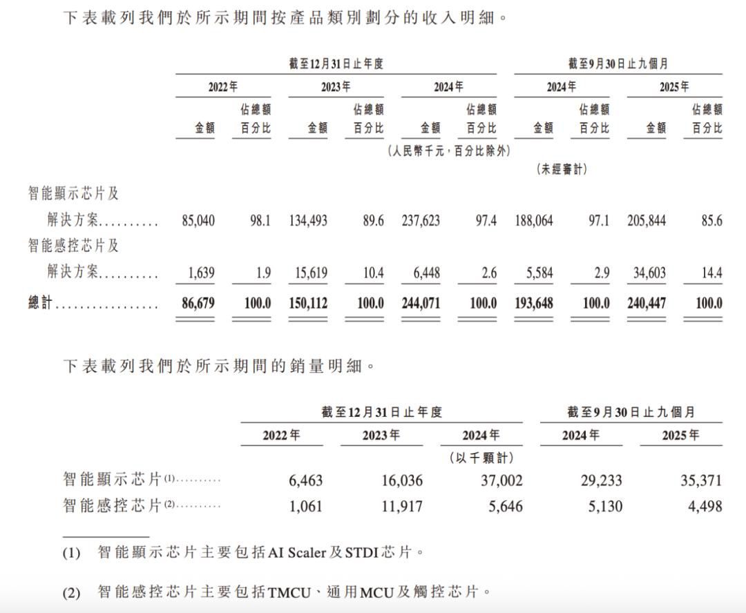 并且从销量来看,曦华科技的智能显示芯片及解决方案在报告期内销量持续增长,但智能感控芯片及解决方案的销量则出现了较大的起伏——2024年及2025年前三季度的销量均出现同比下滑。