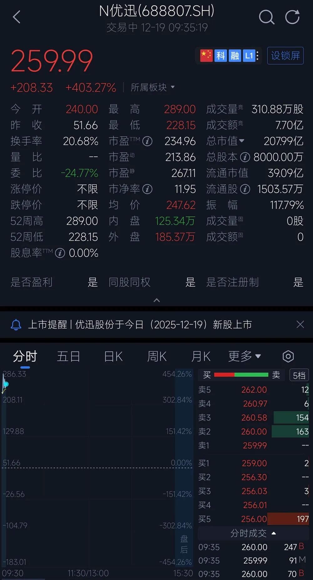 其发行价为51.66元/股,开盘价为240元/股,较发行价上涨364.6%。截至今天9点35分,优迅股份股价较发行价上涨403.25%至259.99元/股,最新总市值约为208.0亿元。
