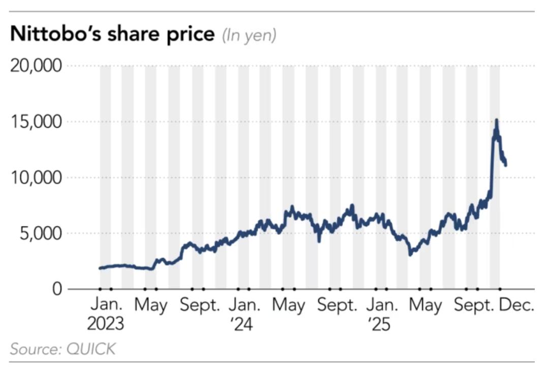 在11月6日的财报电话会议上,日东纺不仅上调了全年盈利预期,还暗示将提前实施产能扩张计划。受此消息提振,其股价在接下来的两周内翻了一番,并在11月20日创下16150日元的历史新高。随后,伴随英伟达的下跌,这家公司的股价也稍有回落。但这也不影响他们再过去两年的狂飙。