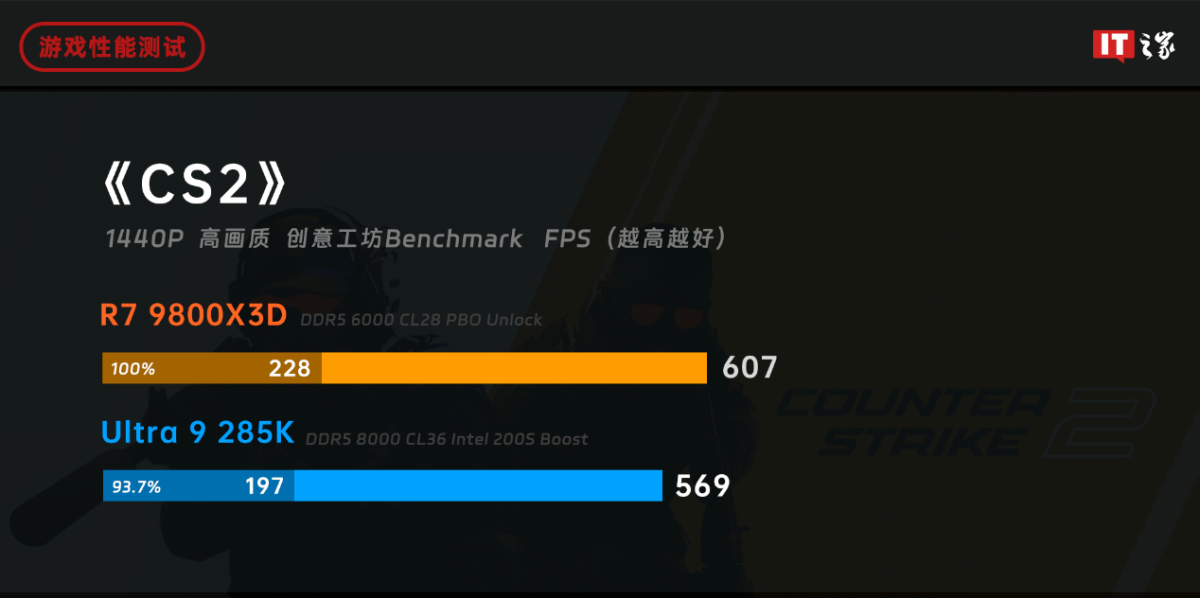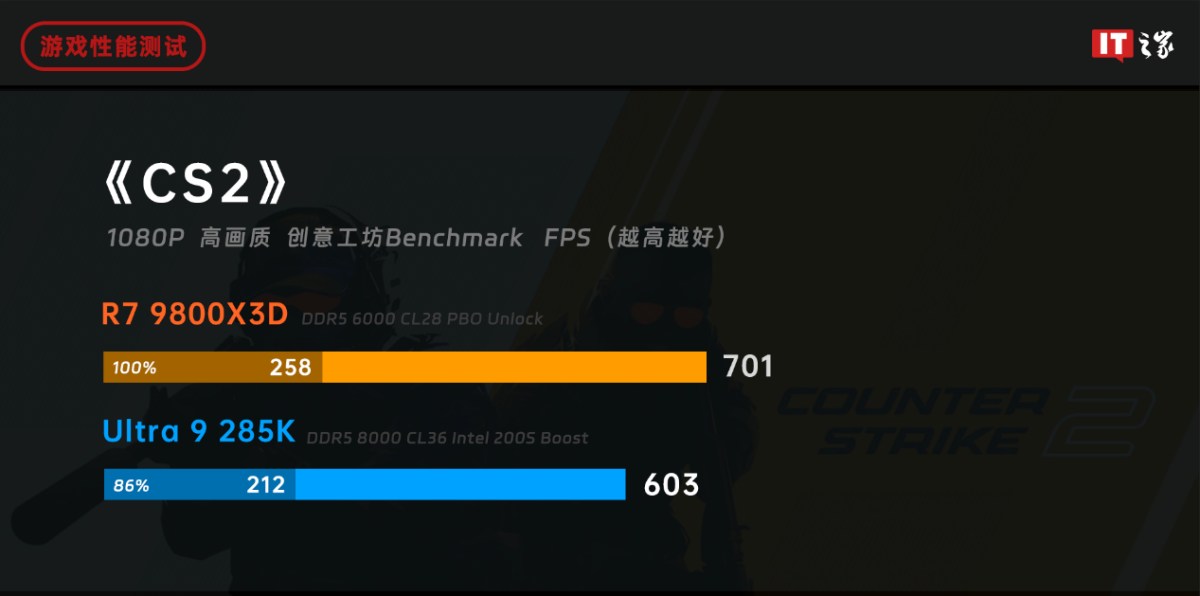 第一款是比较吃 CPU 单核性能的《CS2》,同时对三缓也有一定要求,可以说是 X3D 拥有不错的主场优势。
