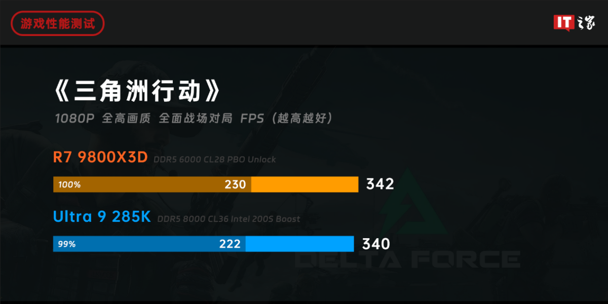 可如果你不是“瓦学弟”,而是一名“干员”,那么无论是选择锐龙 7 9800X3D 处理器还是酷睿 Ultra 9 285K 处理器,在《三角洲行动》这款游戏中的性能差距完全可以忽略,即便锐龙 7 9800X3D 处理器的 1% Low 高出 8 帧,在实际游戏体验上两者很难分出差别。