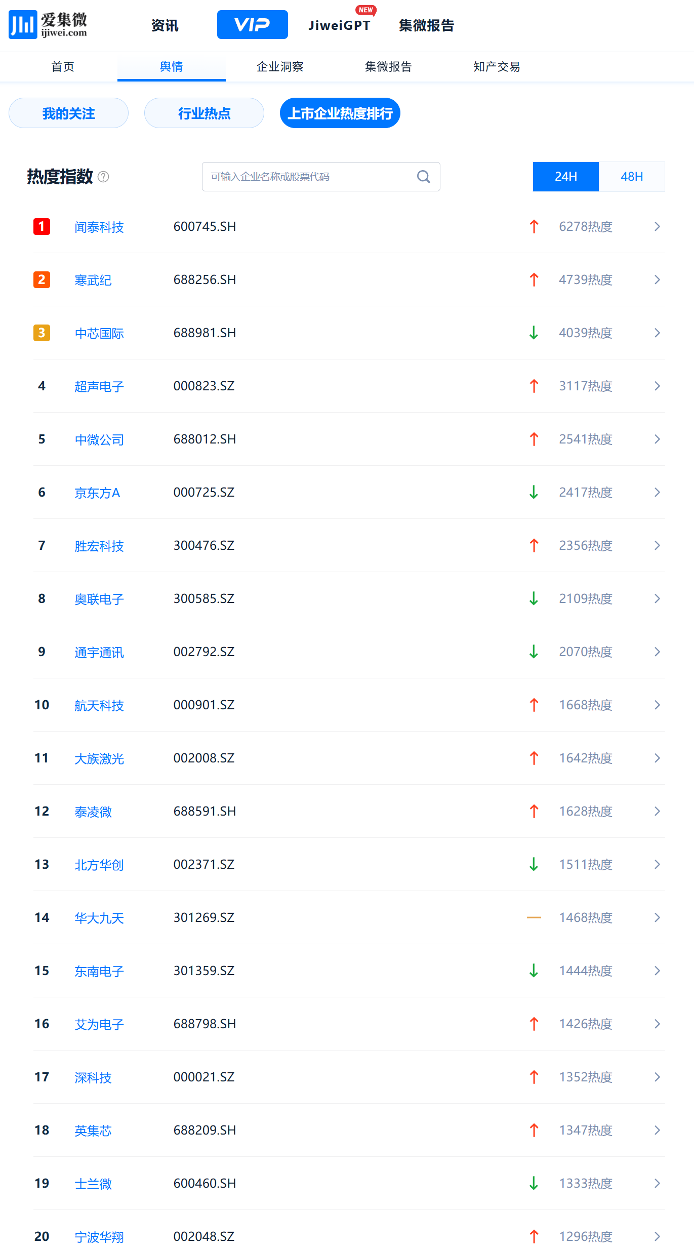 登录爱集微VIP频道,实时查看动态“上市企业热度排行”,穿透洞察每一个波动背后的驱动因素。