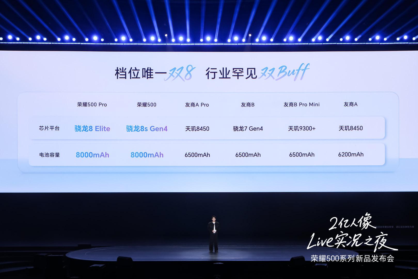 此次荣耀500系列,在前代刷新同档续航纪录的基础上,继续保持了在续航和补电方面的同档位领先(标准版搭载80W有线快充、Pro搭载80W有线快充+50W无线快充)。其采用8000mAh第三代青海湖大电池,具备15%超高硅含量以及915Wh/L超高能量密度。更难得的是,所有一切,都是在保证较为轻薄小巧的机身的前提下做到的。
