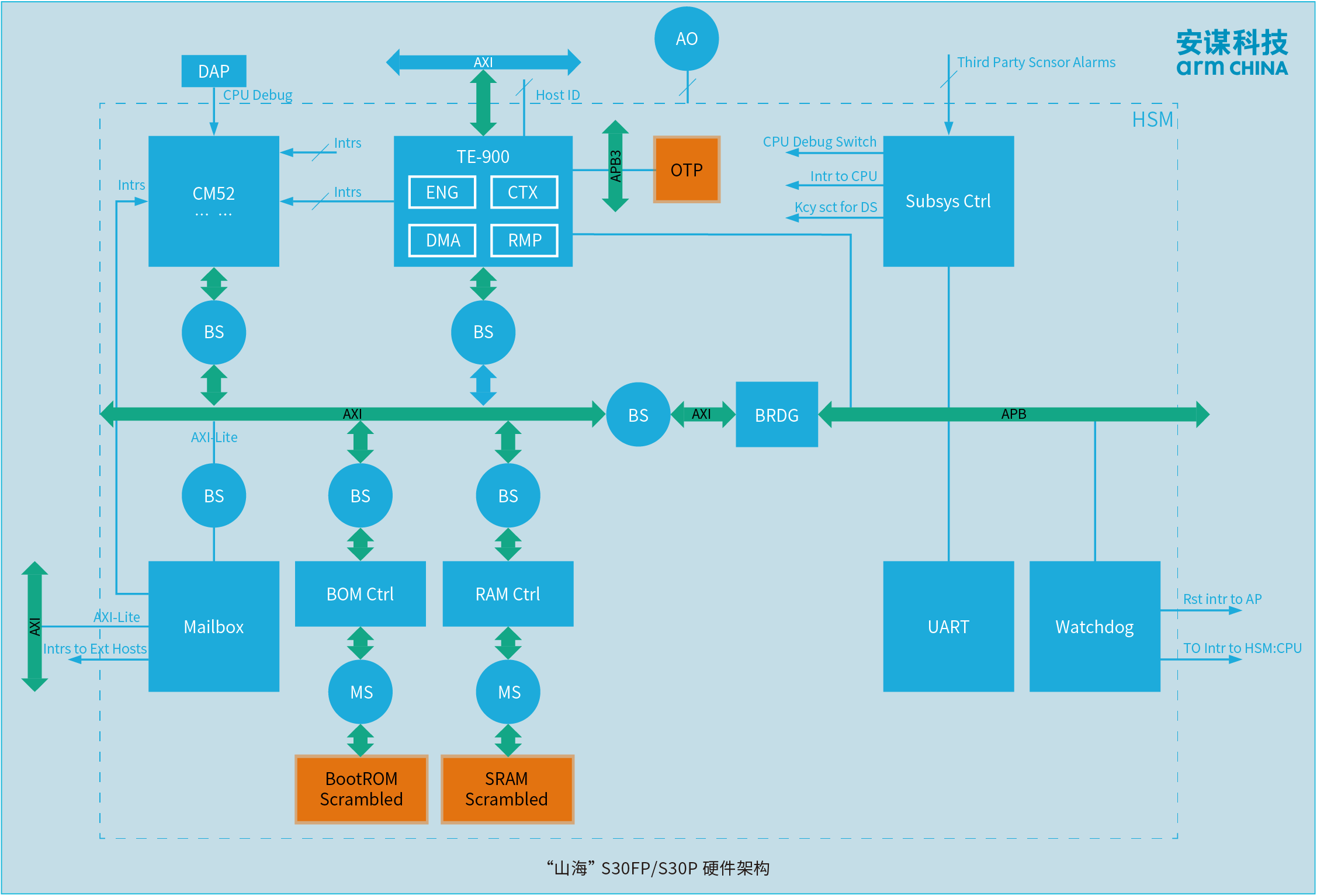 此外,“山海”S30FP/S30P能够与Arm架构无缝融合,支持Arm TrustZone、虚拟化等底层安全架构,和Arm的底层安全架构同源互补,形成系统协同,充分激活整个Arm安全体系的能力,从而建立完善的芯片安全体系。