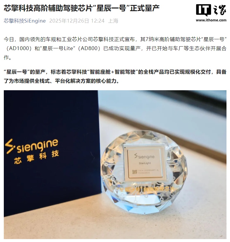 IT之家 12 月 26 日消息,国内车规和工业芯片公司芯擎科技今日宣布,其 7nm 高阶辅助驾驶芯片“星辰一号”(AD1000)和“星辰一号 Lite”(AD800)已成功实现量产,并已开始与车厂等生态伙伴开展合作。