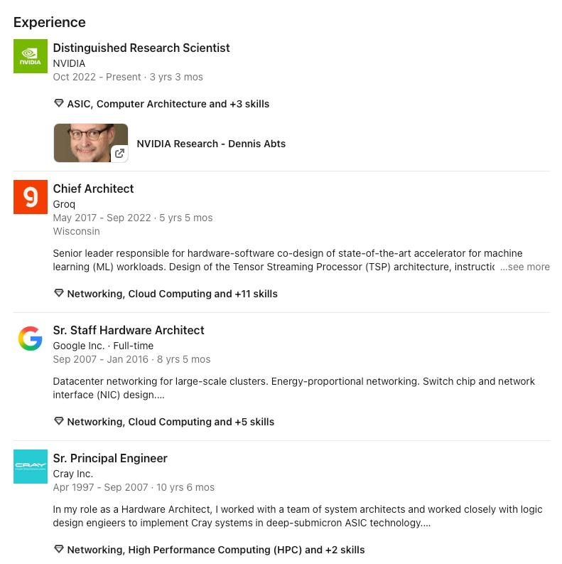 如果你现在去看Groq论文中的第一作者,Dennis Abts,会发现他在 2022 年 10 月加入了 Nvidia。