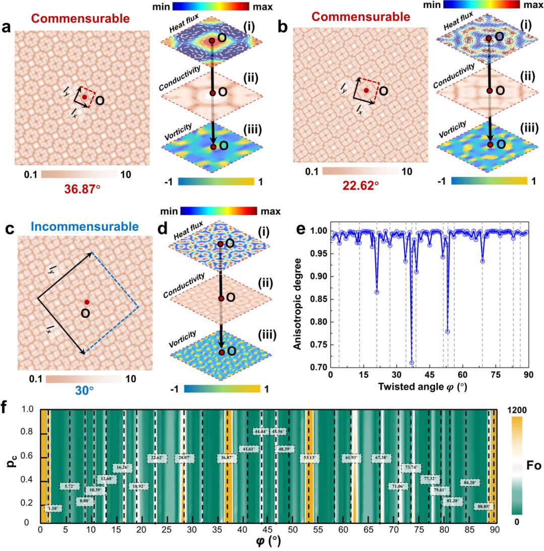 图1. a ~ d 分别展示了在36.87°、22.62°以及30°的等效热导率空间分布;e. 双波矢调控诱导的非对称各向异性程度;f. 不同转角与相对热导率下的傅里叶数分布。