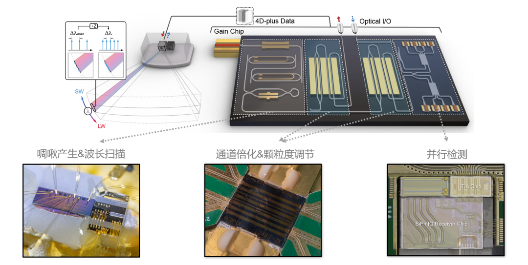 在此基础上,研究团队进一步演示了首个基于集成光梳的实时并行4D成像系统。在获取三维几何信息的同时,系统可同步解析目标速度与反射率信息,并与可见光相机开展多模态融合,实现点云上色,从而补足激光雷达难以直接获取的颜色外观信息,提升场景可解释性与语义表达能力,形成面向智能体任务的4D-plus场景表征。上述验证表明,该架构通过“凝视”资源分配提升有效采样效率,并将芯片级可重构并行通道作为核心能力支撑,为相干激光雷达走向可扩展、小型化、低功耗的集成化系统方案提供了系统级路径。