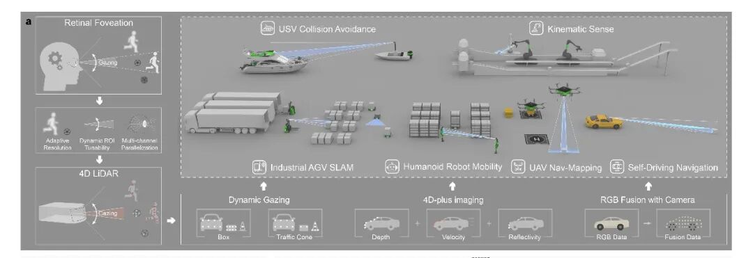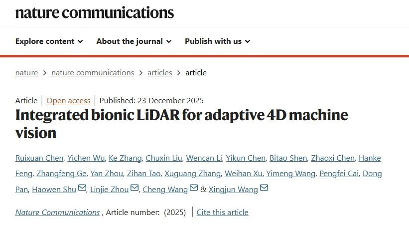 12月23日,北京大学王兴军教授-舒浩文研究员团队、香港城市大学王骋教授团队及上海交通大学周林杰教授团队在Nature Communications期刊在线发表题为 “Integrated bionic LiDAR for adaptive 4D machine vision”的研究论文。研究团队提出并验证了一种受人眼视觉机制启发的集成仿生FMCW激光雷达新架构,首次在芯片尺度上实现具备“凝视”能力的自适应并行4D成像系统,并进一步通过与相机协同感知实现4D-plus机器视觉表达,为“高分辨率、低功耗、高灵活性”的下一代智能感知提供了新的路径。