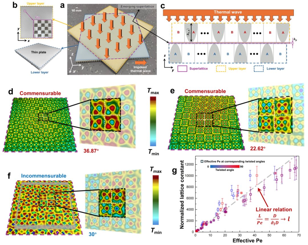 图2. a ~ c 展示了用于实现线性莫尔热传输的实现方案与实验设计;d ~ f 展示了转角为36.87°、22.62°以及30°的界面温度场分布;g. 归一化莫尔晶格常数与等效佩克莱数的线性关系。