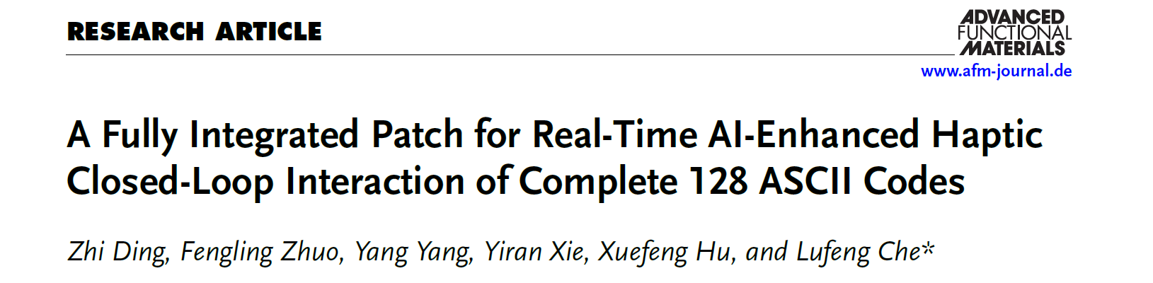 近日,浙江大学信息与电子工程学院车录锋教授团队在可穿戴贴片构筑全ASCII码触觉闭环人机交互方面取得最新进展,相关研究成果以“A Fully Integrated Patch for Real-Time AI-Enhanced Haptic Closed-Loop Interaction of Complete 128 ASCII Codes”为题,发表于国际材料领域顶级期刊《Advanced Functional Materials》。浙江大学信息与电子工程学院博士生丁智为论文第一作者,本科生杨洋、谢奕然参与了相关研究工作,浙江大学和浙江大学绍兴研究院为署名单位。