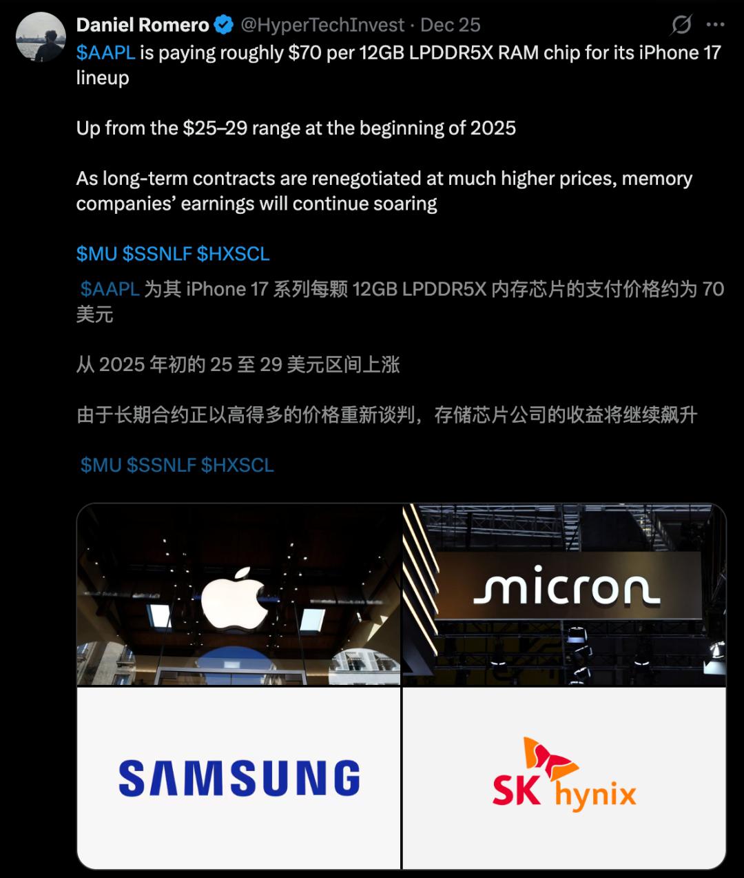 有爆料称,苹果为了iPhone 17系列,每一颗12GB的LPDDR5X内存芯片,大约要付70美元。