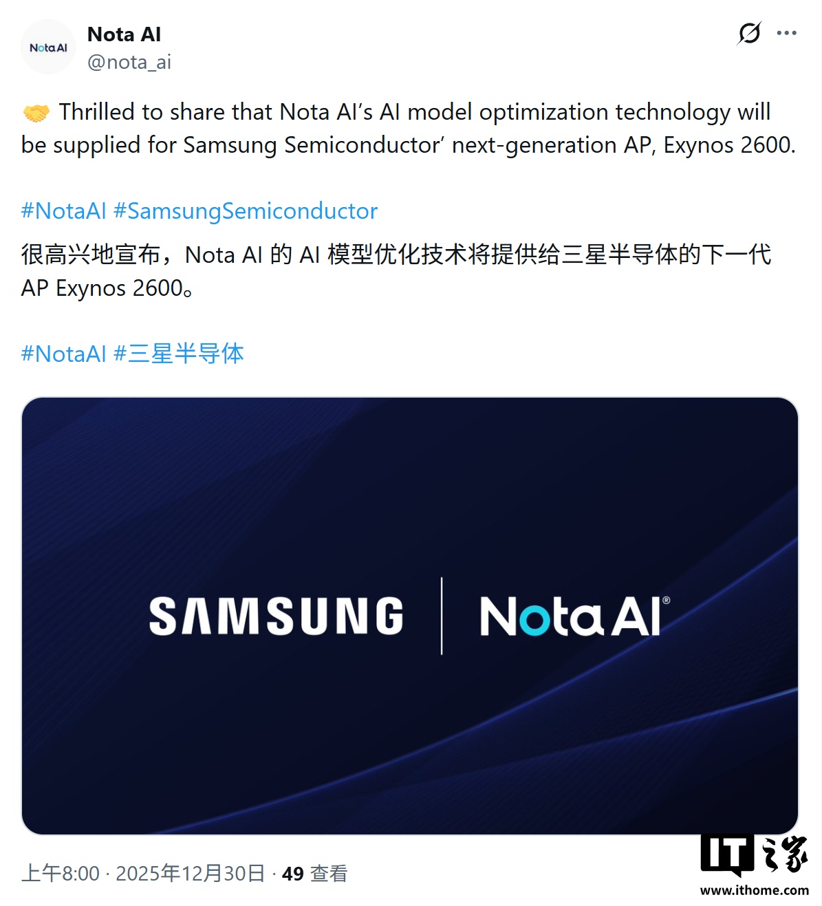 IT之家 12 月 30 日消息,韩媒 ETNews 今天(12 月 30 日)发布博文,报道称三星 Exynos 2600 芯片将整合 Nota 公司的 AI 模型优化方案,在保持模型精度的前提下将 AI 模型体积压缩 90% 以上。