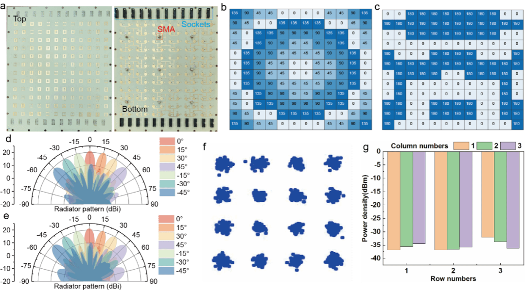 电磁多维融合幅散可重构智能超表面:(a)阵列原型,(b)辐射模式初始相位,(c)30°波束扫描编码,辐射模式下(d)E面和(e)H面波束扫描特性,(f)16QAM传输星座图,(g)接收模式无线能量收集