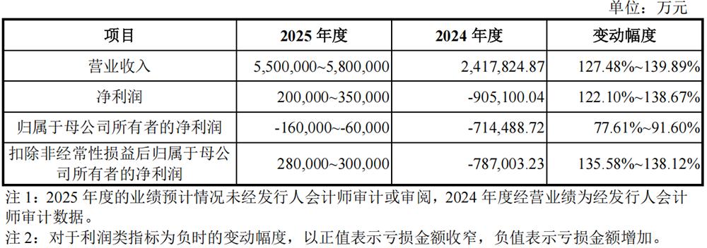 该公司截至2025年6月30日的累计亏损为408.57亿元,预计2025年营收为550亿元~580亿元,净利润为20亿元~35亿元,实现扭亏为盈。