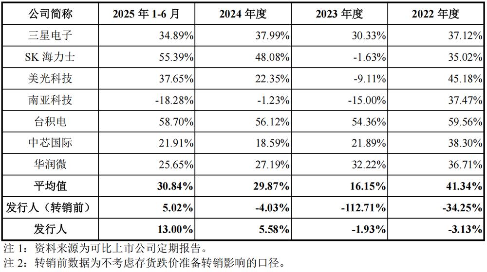 2022年、2023年、2024年、2025年1-6月,长鑫科技的综合毛利率分别为-34.25%、-112.71%、 -4.03%、5.02% ,今年上半年毛利率转正,但总体仍低于可比公司平均水平。