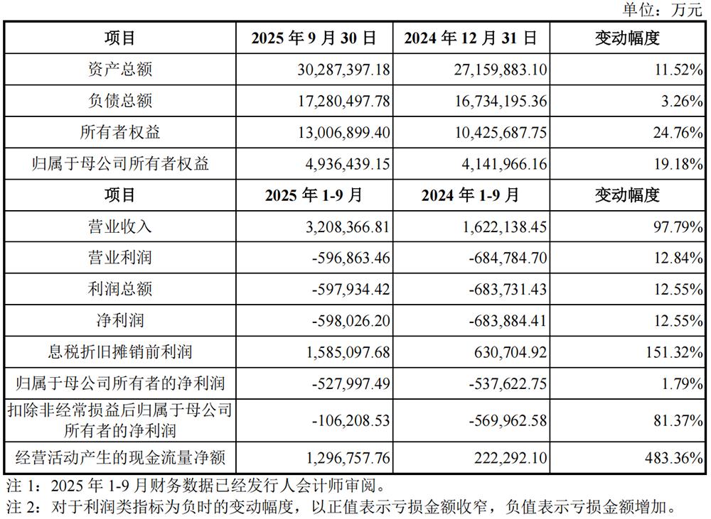 2022年至2025年9月,该公司累计营收达736.36亿元。其中在2025年1-9月,其营收为320.84亿元,同比增长97.79%;净利润为-59.80亿元,同比减亏12.55%。