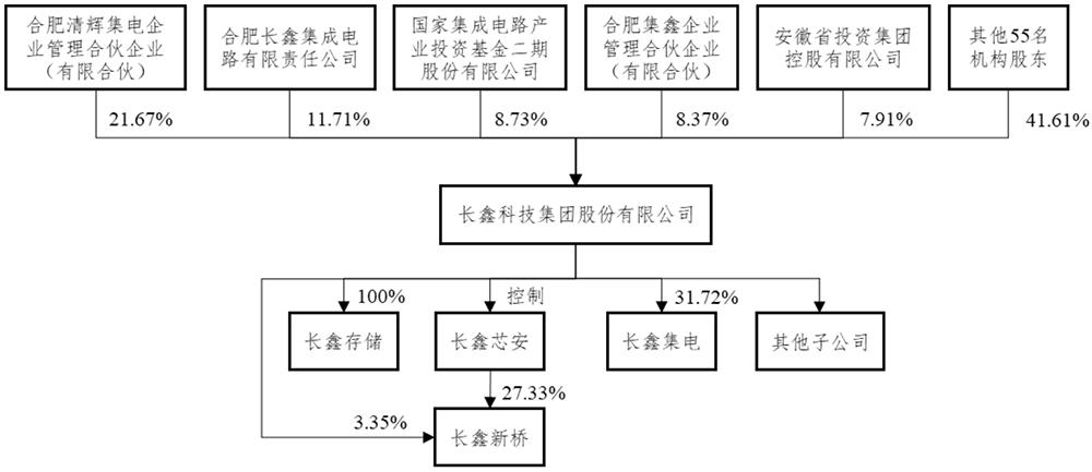 清辉集电、长鑫集成、大基金二期、合肥集鑫、安徽省投的直接持股比例均超过5%,分别持有长鑫科技21.67%、11.71%、8.73%、8.37%、7.91%的股权。