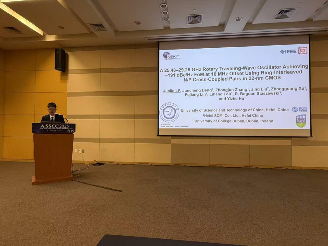 该成果以“A 25.48–29.25 GHz Rotary Traveling-Wave Oscillator Achieving −191 dBc/Hz FoM at 10 MHz Offset Using Ring-Interleaved N/P Cross-Coupled Pairs in 22-nm CMOS”为题发表。我院硕士研究生、论文第一作者李俊霖在大会Oscillators专题作现场汇报,我院博士研究生邓俊程为第二作者,胡诣哲教授担任通讯作者。该研究工作得到了合肥中科微电子创新中心有限公司资助,同时得到了安徽省集成电路科学与技术重点实验室的大力支持。