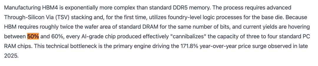 每一片被分配用于生产HBM4的12英寸晶圆,本质上就是从全球DRAM供应池中抽走了三片用于生产PC或手机内存的晶圆。
