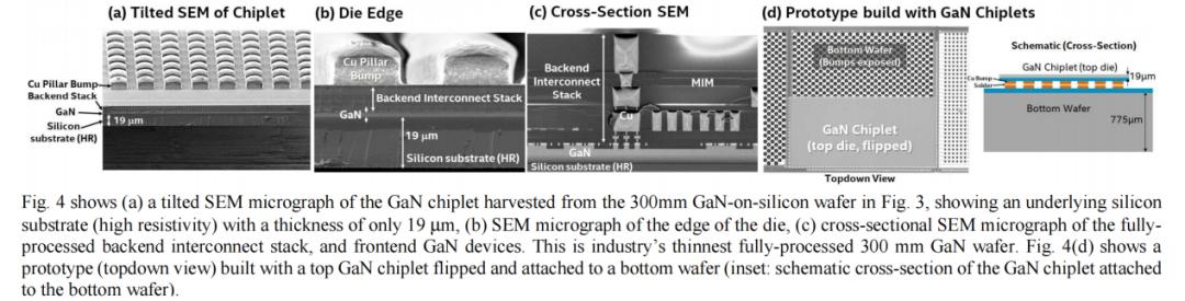 图 4(a-c) 展示了从图 3 所示的 300 mm GaN-on-silicon 晶圆中提取的 GaN Chiplet的 SEM 显微照片,显示了厚度仅为 19 µm 的底层硅衬底。横截面 SEM 显微照片显示了完全加工的后端互连堆叠和前端 GaN 器件。需要强调的是,这是业界最薄的完全加工的 300 mm GaN 晶圆。图 4(d) 展示了一个原型,其顶部 GaN Chiplet翻转后连接到底部晶圆上。