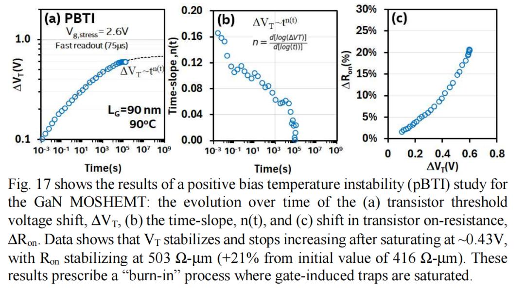 图 17 显示了 GaN MOSHEMT 的正偏压温度不稳定性 (pBTI) 研究结果。其中,阈值电压 (VT) 在饱和至约 +0.43 V 后稳定并停止增加,导通电阻 (Ron) 稳定在 503 Ω-µm(较初始值 416 Ω-µm 增加 21%)。这些结果表明需要进行“老化”过程,以使栅极感应陷阱达到饱和。在读出 (RO) 间隔期间,移除栅极应力 (Vg,stress),并在应力移除后的 75 µs 短时间内测量晶体管参数。如此快速的读出可确保阈值电压 (VT) 在读出间隔期间不会显著恢复。