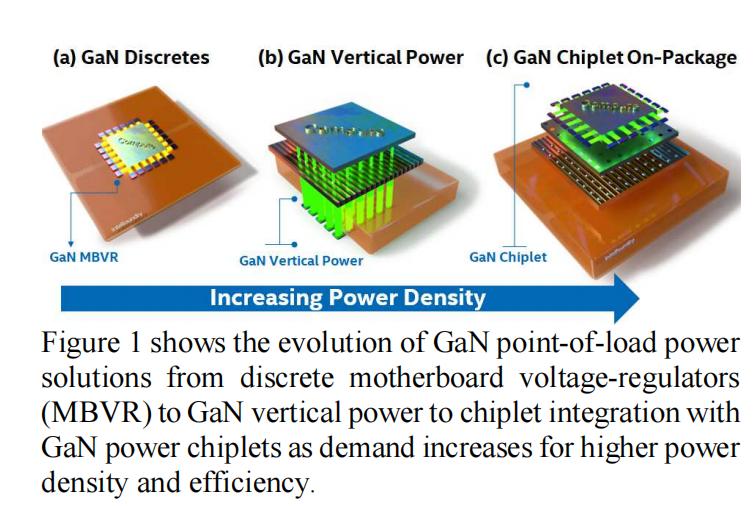 在此前,就有专家提出了 300mm GaN-on-silicon 技术,由于其卓越的性能指标 (FoM) 以及将低电压至 48V GaN 与硅 CMOS 集成的能力,正成为高密度、高性能功率和高速/射频电子器件领域极具吸引力的技术。图 1 展示了 GaN 负载点电源解决方案的潜在发展方向:从分立式主板电压调节器 (MBVR) 到采用 GaN 功率芯片的Chiplet集成,以满足对更高功率密度、更高效率(例如,降低 I²R 布线损耗)和更紧密集成度的需求。