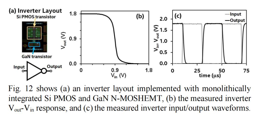 图12为采用单片集成GaN N-MOSHEMT和Si PMOS实现的反相器,展示了测得的反相器Vout-Vin响应以及输入/输出波形。