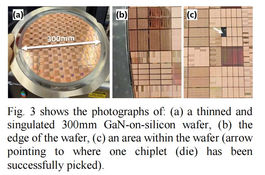 图 3 展示了减薄并切割成单片的 300 mm GaN-on-silicon 晶圆的照片,包括 (b) 晶圆边缘和 (c) 晶圆内成功取出一个Chiplet(晶粒)的区域。该晶圆采用 SDBG(研磨前隐蔽切割:stealth dicing before grinding)工艺进行减薄和切割。