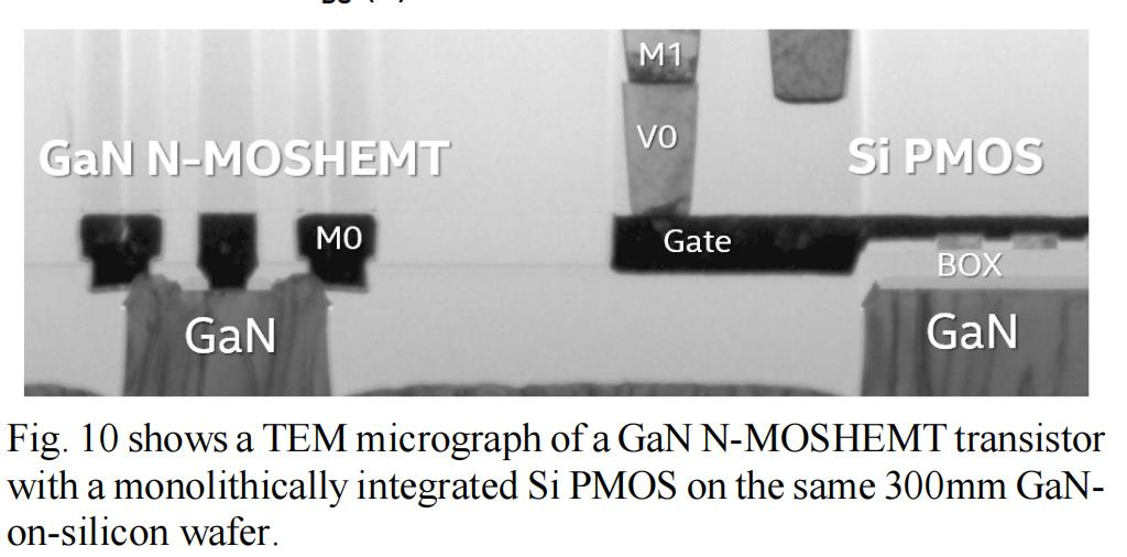图10为单片集成在300mm硅基GaN晶圆上的GaN N-MOSHEMT晶体管和Si PMOS的透射电镜(TEM)图像。