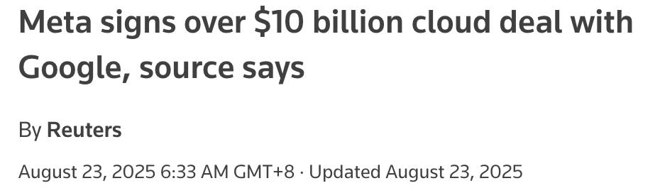 据路透社援引知情人士称,去年8月,Meta与谷歌云达成了一项为期6年、价值超过100亿美元的云计算协议,用于支撑其AI基础设施。