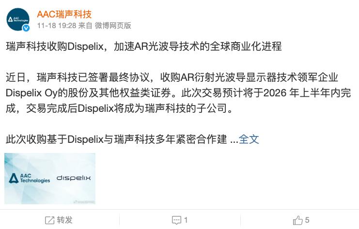 比如在活动现场我们了解到,瑞声科技最近收购了芬兰一家名叫 Dispelix 的光波导企业,开始进军高端的衍射光波导显示业务了。
