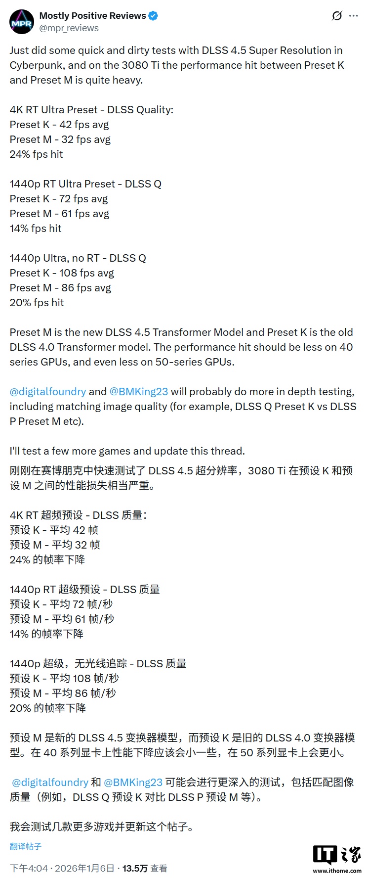 新驱动发布后,X 平台的 Mostly Positive Reviews 在 RTX 3080 Ti 上运行了《赛博朋克 2077》基准测试,将 DLSS 4.5 与 4.0 进行比较,发现计算量更大的 DLSS 4.5 带来了高达 24% 的性能下降。