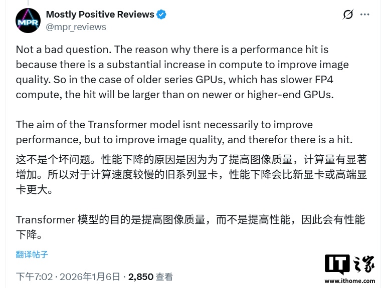 Mostly Positive Reviews 认为,性能下降的原因是为了提高图像质量,计算量有显著增加。所以对于计算速度较慢的旧系列显卡,性能下降会比新显卡或高端显卡更多。