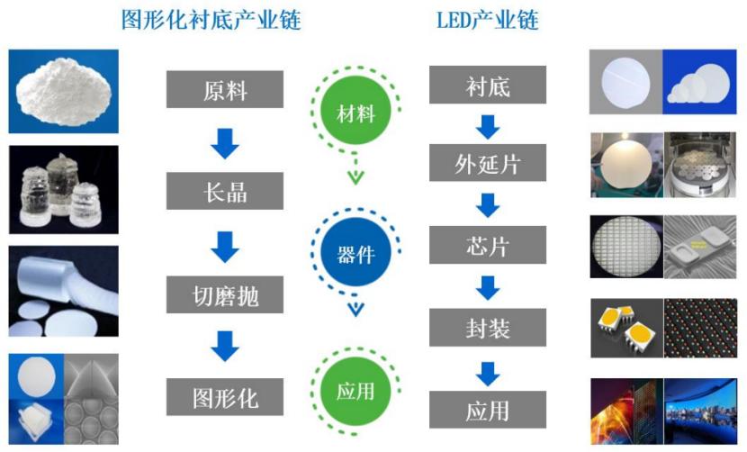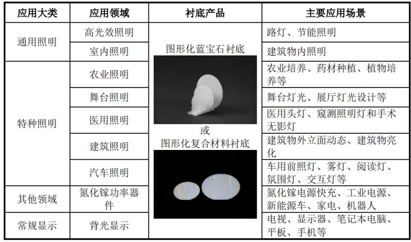 图形化衬底是LED行业重要的基础原材料,图形化衬底经过外延、芯片制造、封装等工序制成LED器件,广泛应用于新型显示、常规显示、通用及特种照明等可视场景中。