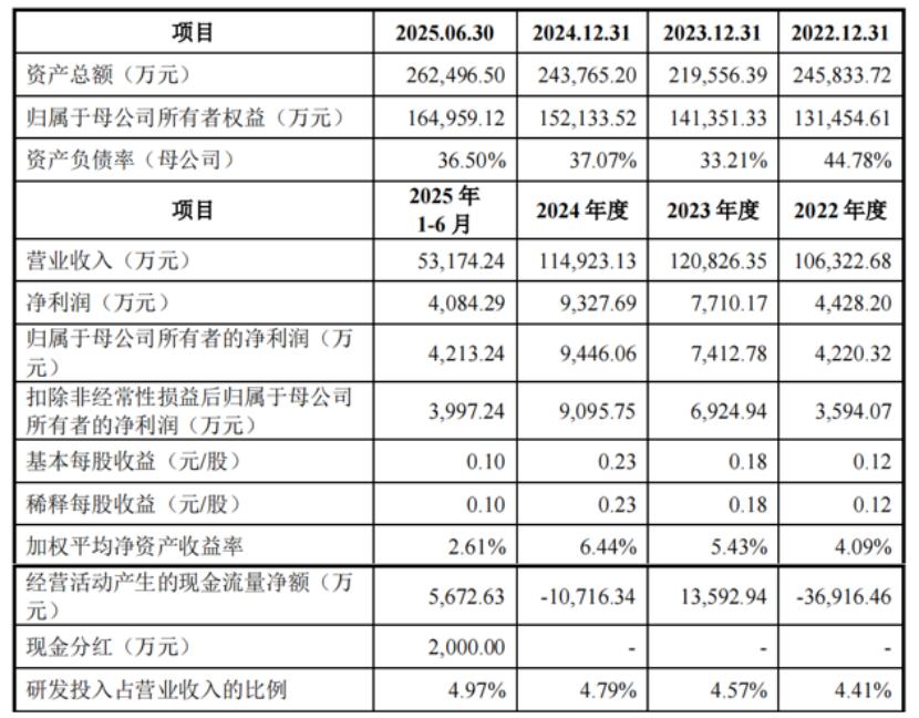2022年、2023年、2024年及2025年1-6月(报告期),公司营业收入分别为10.63亿元、12.08亿元、11.49亿元、5.32亿元;归属于母公司股东的净利润分别为4220.32万元、7412.78万元、9446.06万元和4213.24万元。