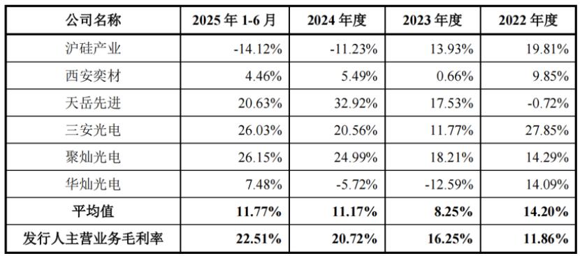 与同行业公司相比,公司主营业务毛利率与天岳先进、三安光电、聚灿光电的毛利率水平比较接近。