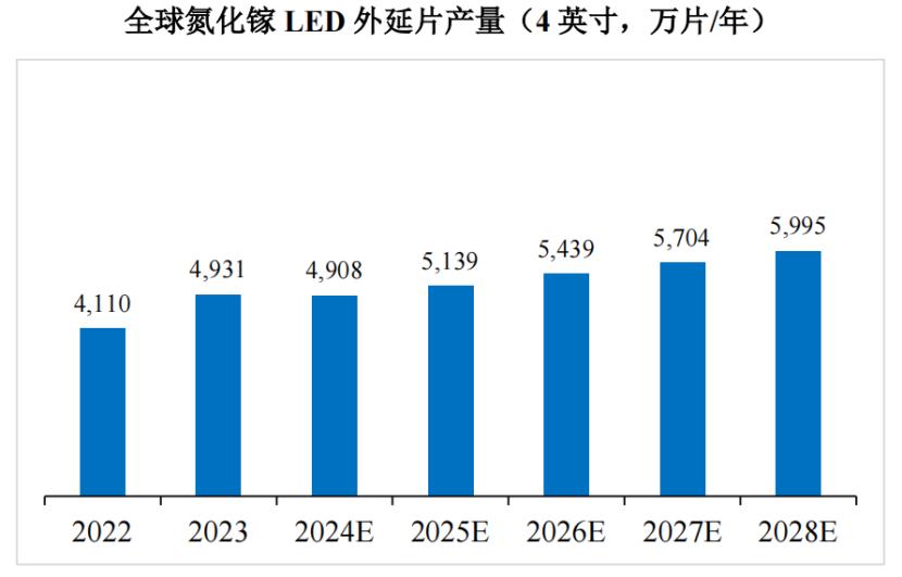 根据LEDinside对全球氮化镓LED外延片产量的统计预测,2025年度全球氮化镓LED外延片产量达5139万片,预期2028年增长至5995万片,增幅较为明显。