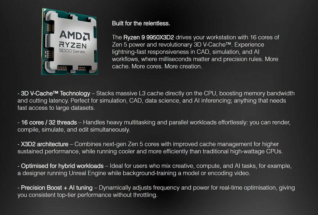 在该公司的网站工作站页面下,锐龙9 9950X3D2作为“NexStation”系统的一部分被列出。这款16核/32线程配置的芯片采用了“X3D2架构”,宣称在运行过程中比传统CPU具有更出色的缓存管理,且运行温度更低。在NexStation中,9950X3D2将与AMD的Radeon AI PRO 9700 GPU搭配使用。
