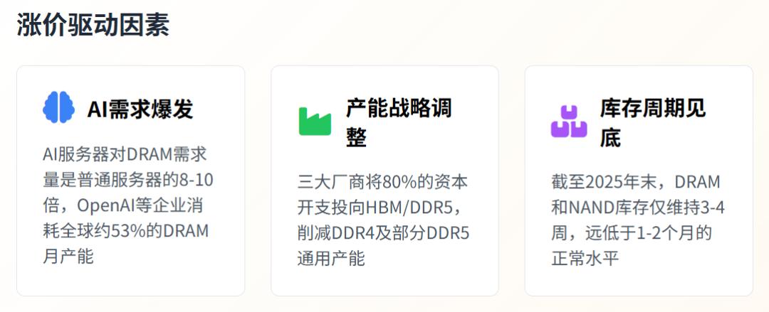 比如三星、SK海力士、美光等厂商,将80%的资本开支投向HBM/DDR5,导致传统内存供给出现结构性短缺。